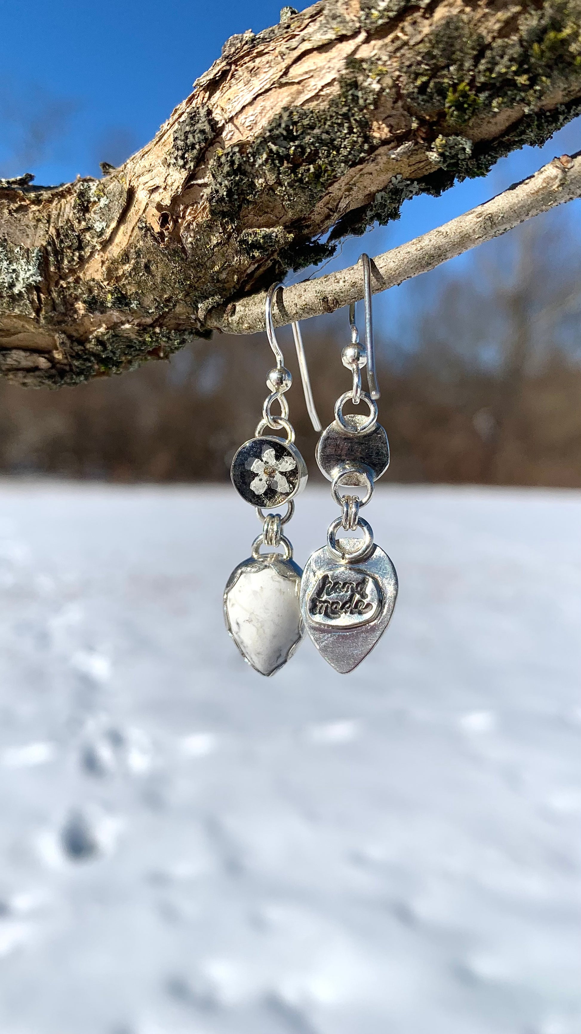 Sterling silver ear wires with sterling silver beads attached to preserved white forget-me-not flowers with a sprinkled sterling silver dust background in resin. Howlite crystals dangle with "handmade" stamps on the back of each. Homegrown, soldered, and handmade by Gemini Beautify.