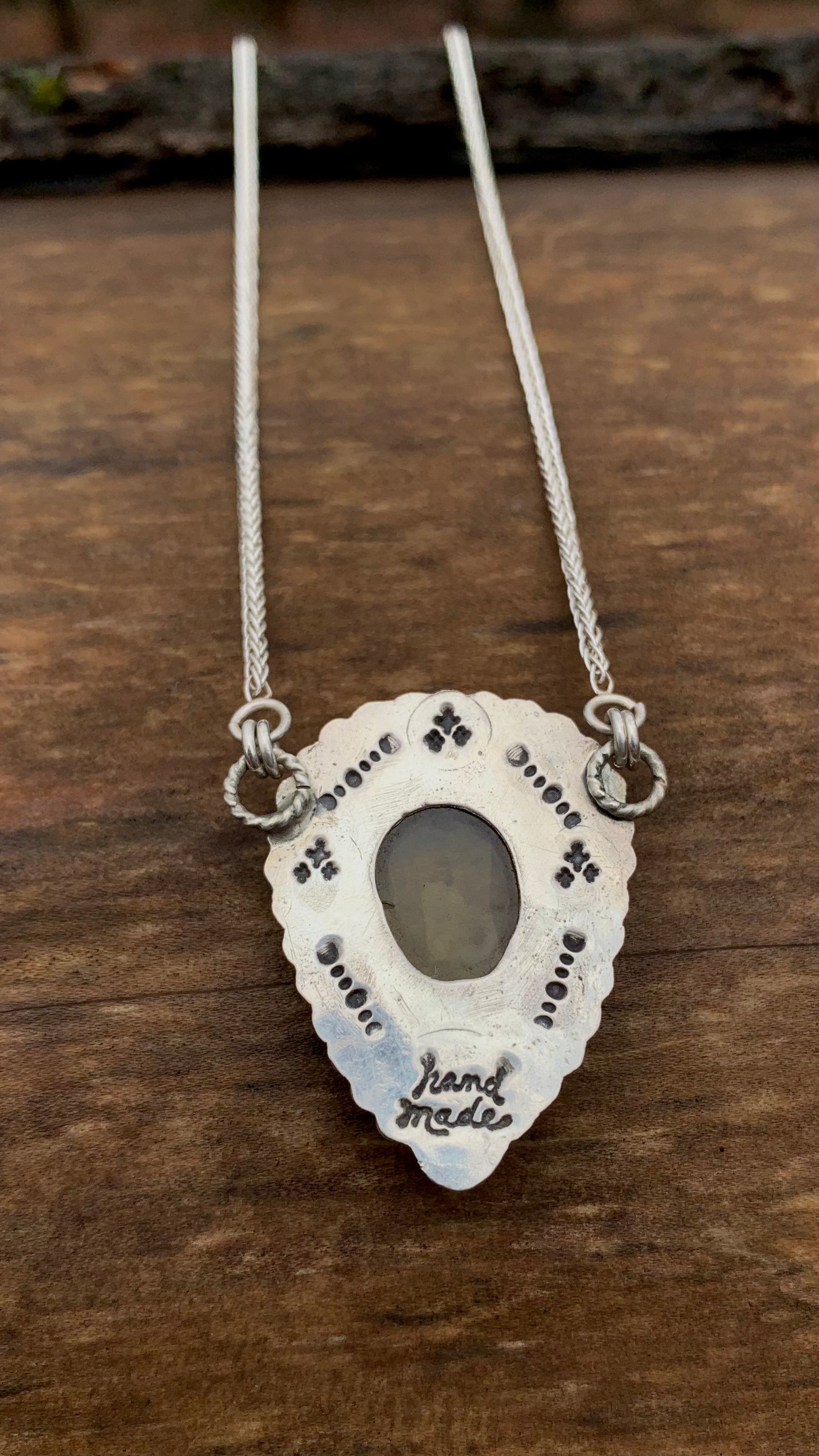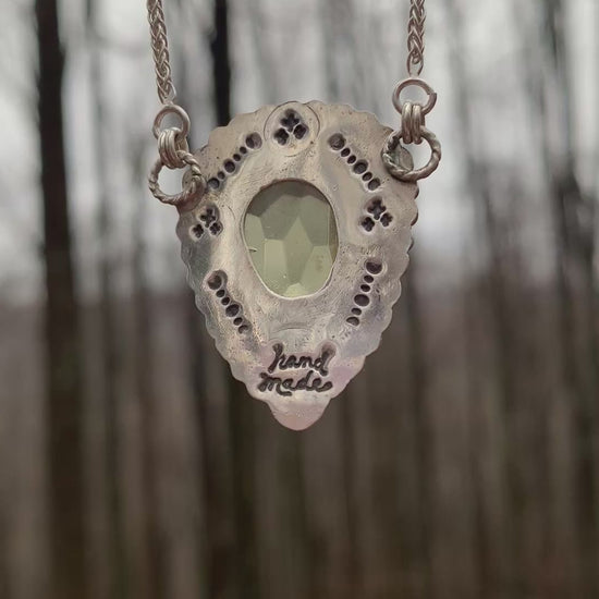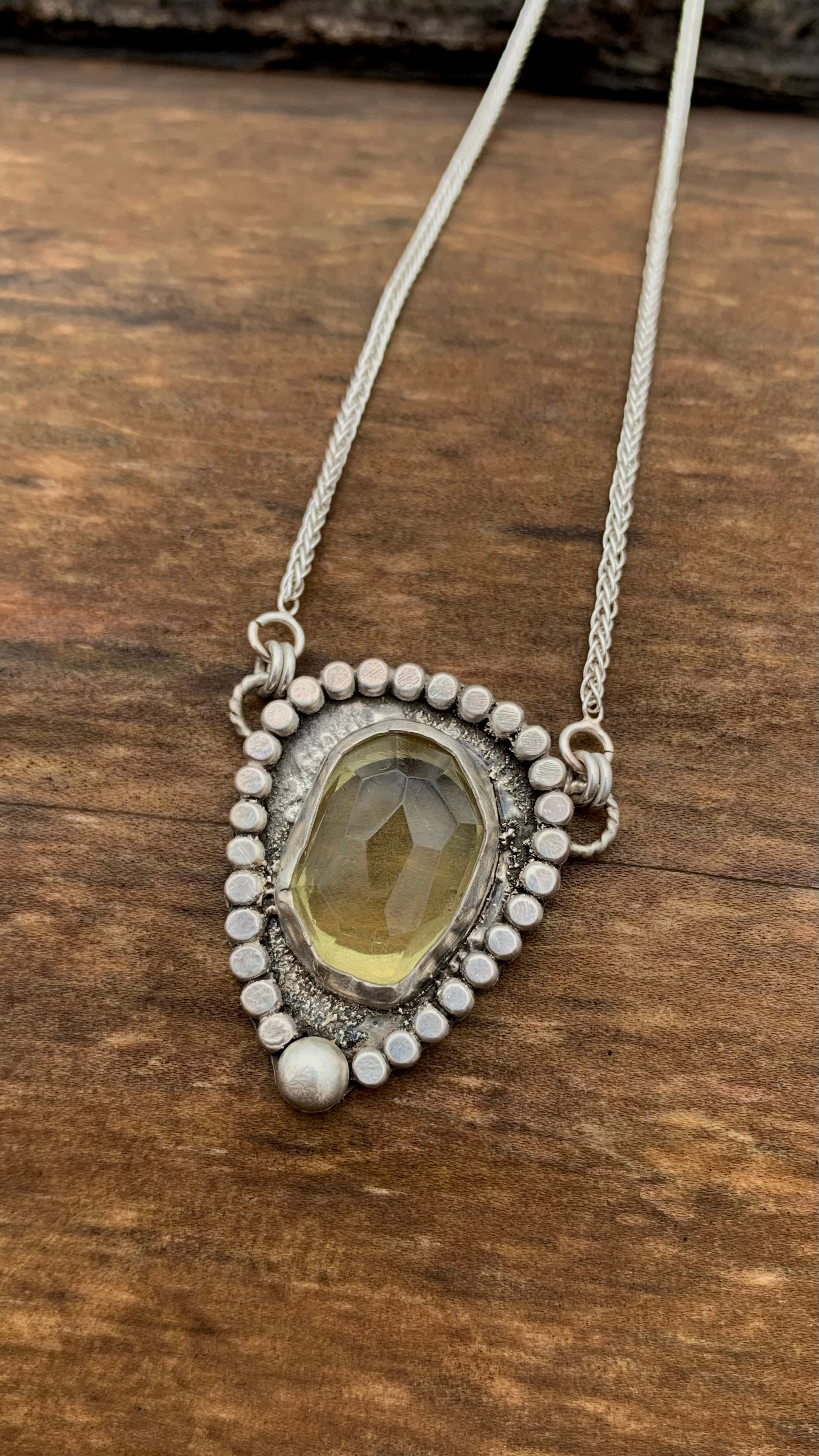 Hand-crafted from sterling silver, this statement necklace features a dazzling faceted Lemon Quartz crystal. The pendant showcases a portal on the back, allowing light to radiate through the captivating crystal. Intricate hand-stamped details and sterling silver beads enhance the design, while a 16-inch sterling silver chain completes the luxurious look.