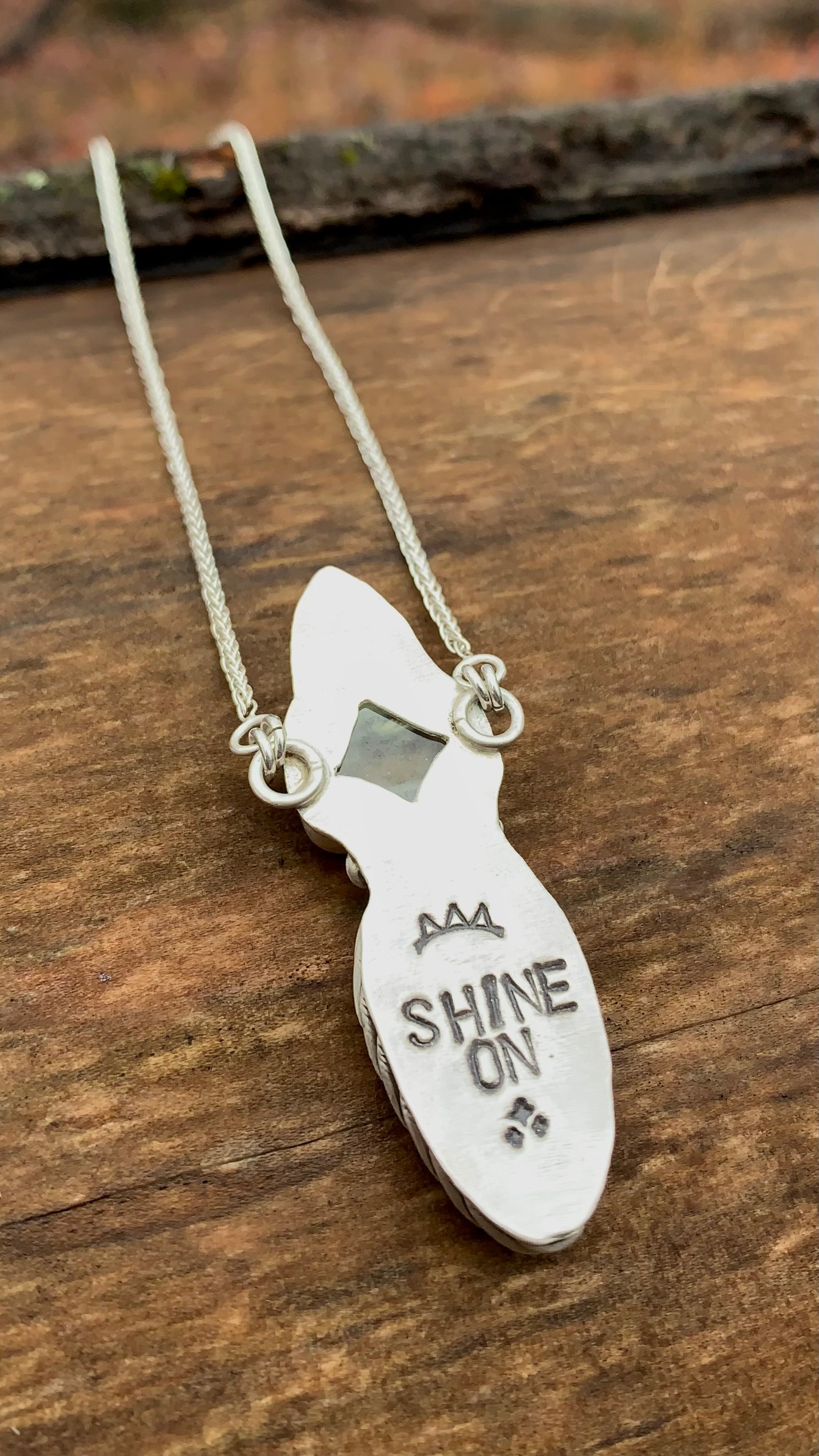 An exquisite handcrafted pendant showcasing a delicate yarrow leaf eternally preserved within resin, set with a striking Prehnite gemstone. Brass accents provide subtle warmth to the sterling silver frame, while the 16-inch sterling silver chain completes this nature-inspired piece with understated elegance. A reminder to keep shining is hand-stamped on the back.