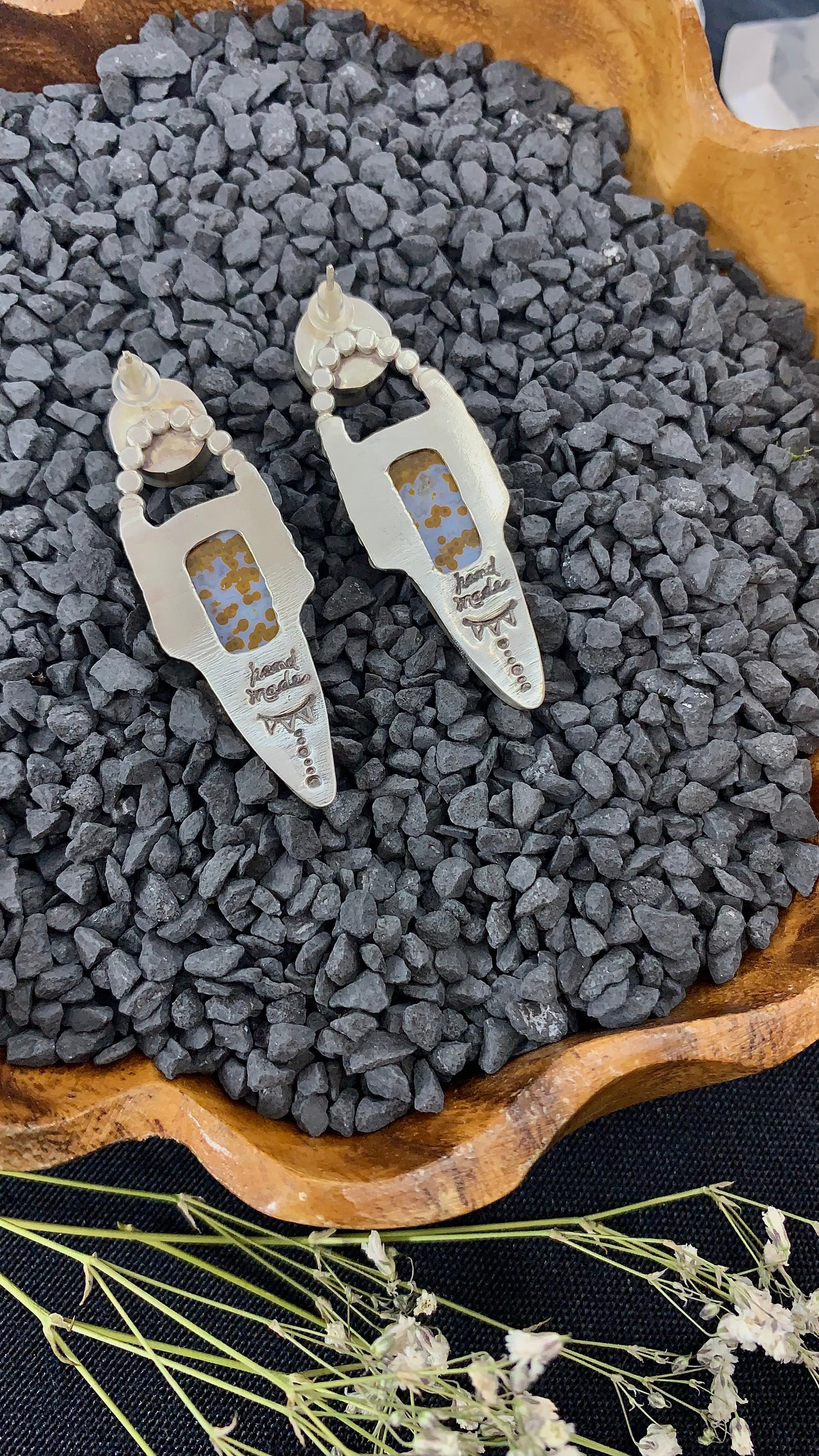 These exquisite statement studs are crafted from sterling silver and showcase delicate forget-me-not flowers encapsulated in resin and adorned with stunning Polka Dot Agate. The back of each stud bears a "handmade" stamp with intricate accents.