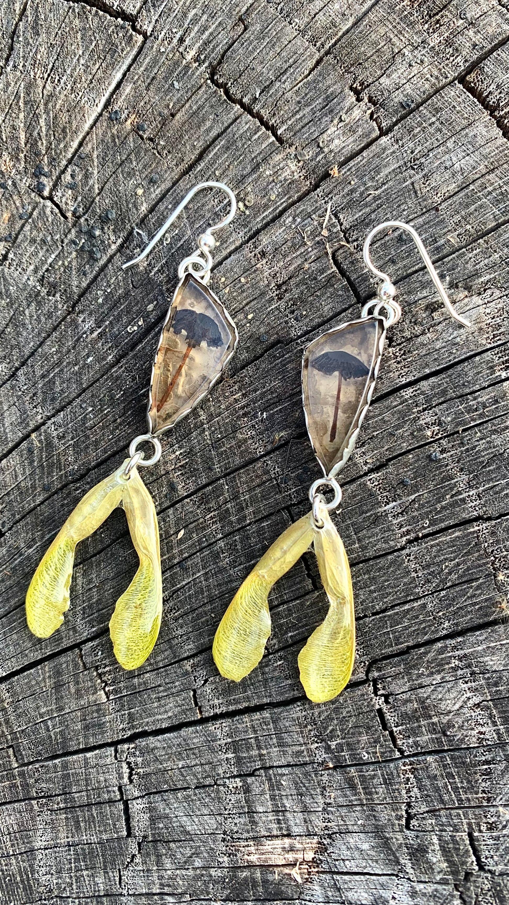 These earrings feature sterling silver ear wires dangling smoky quartz crystals with real mushrooms stored within the bezels along with preserved maple seeds set in resin. The back of each earring have delicately stamped details.