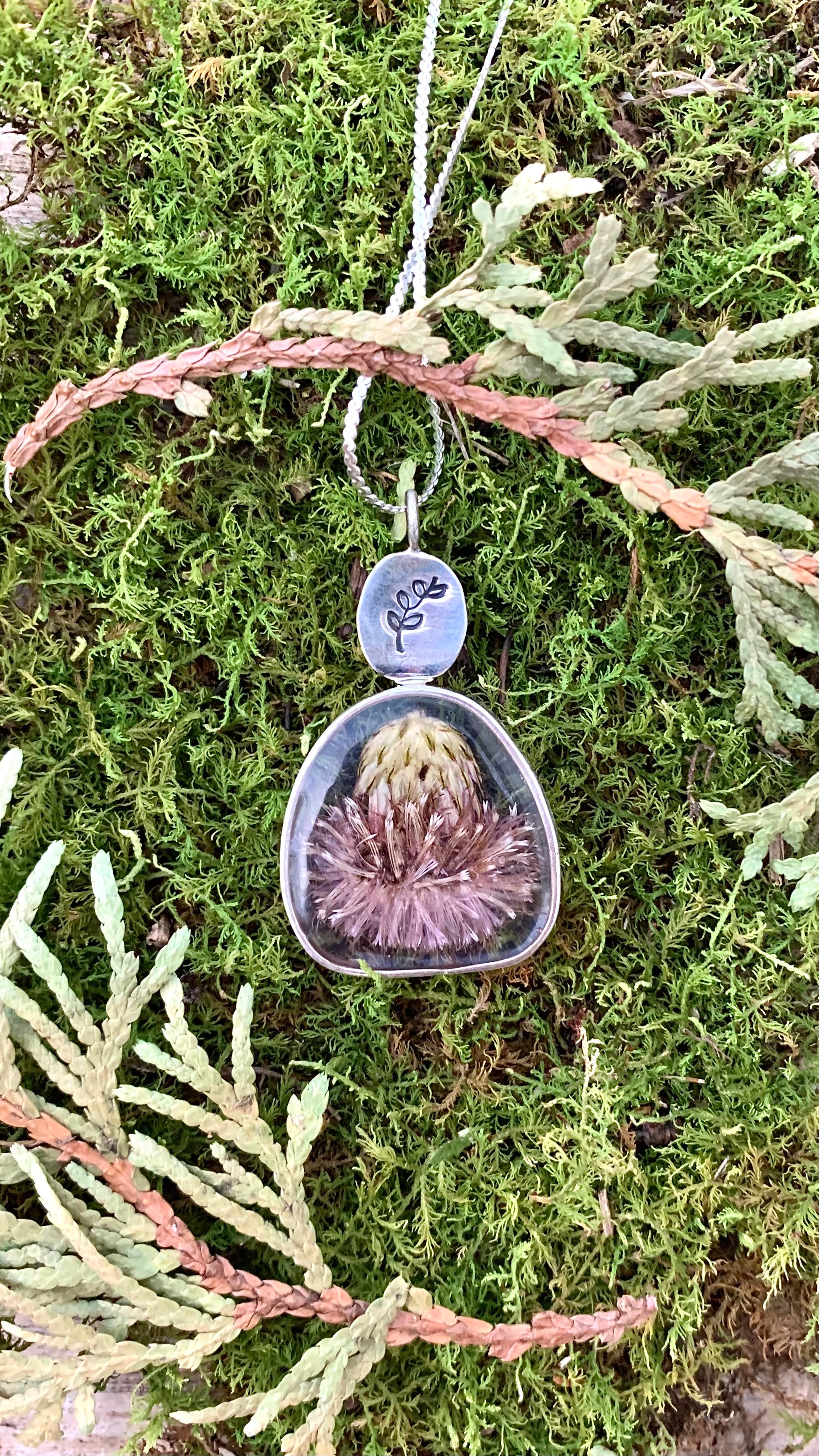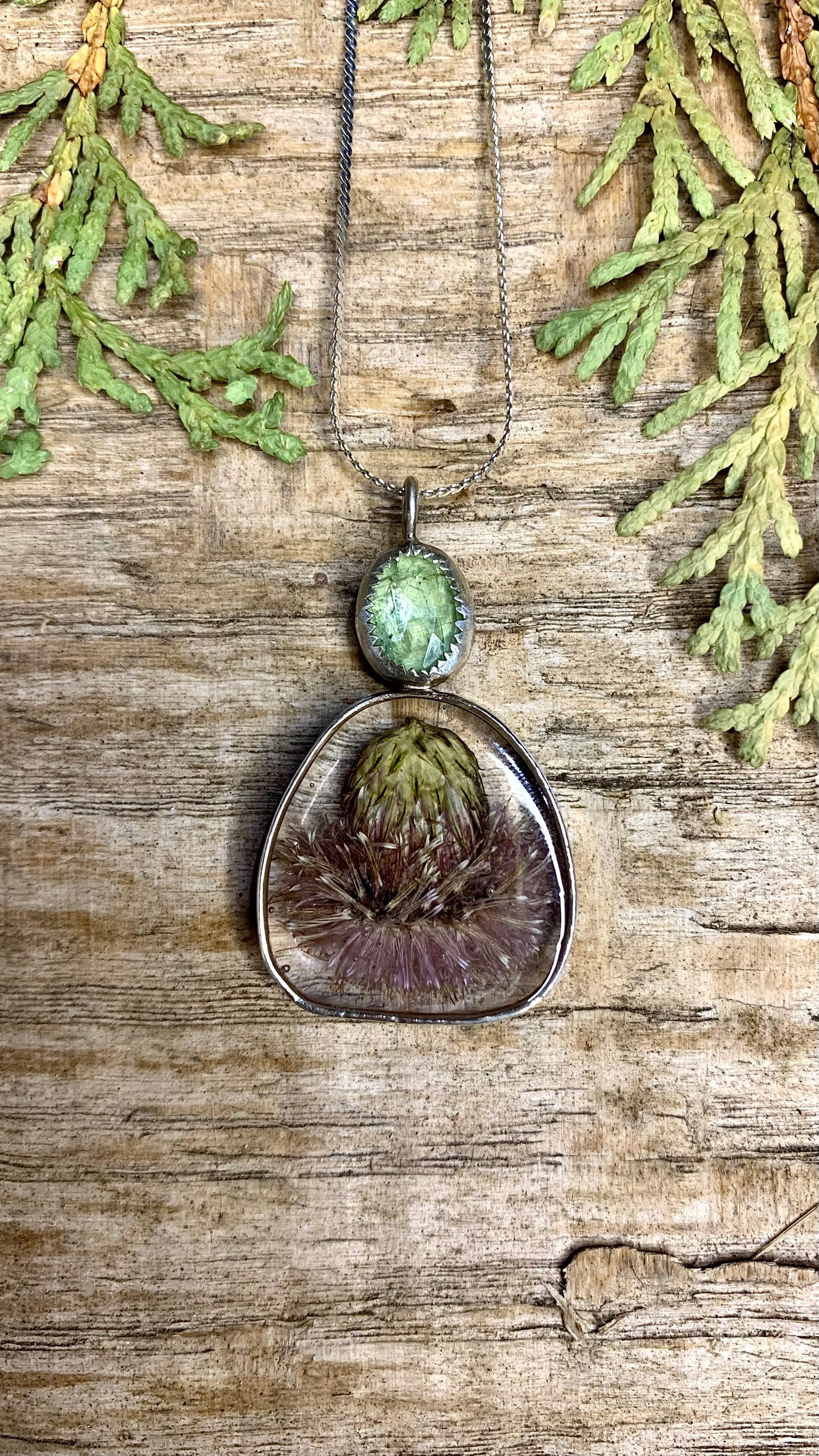 Expertly handcrafted, this necklace features a sterling silver frame that beautifully encases a preserved thistle bloom in resin along with a moss kyanite crystal. The back of the pendant is adorned with a stamped leaf, and it hangs from an 18 inch sterling silver chain.